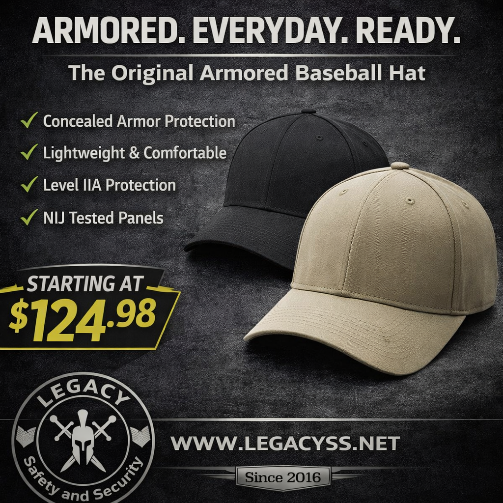 The Legacy Safety Armored Baseball Hat delivers NIJ tested Level II protection in a low-profile design that looks like a standard baseball cap — but provides serious defensive capability when it matters most.